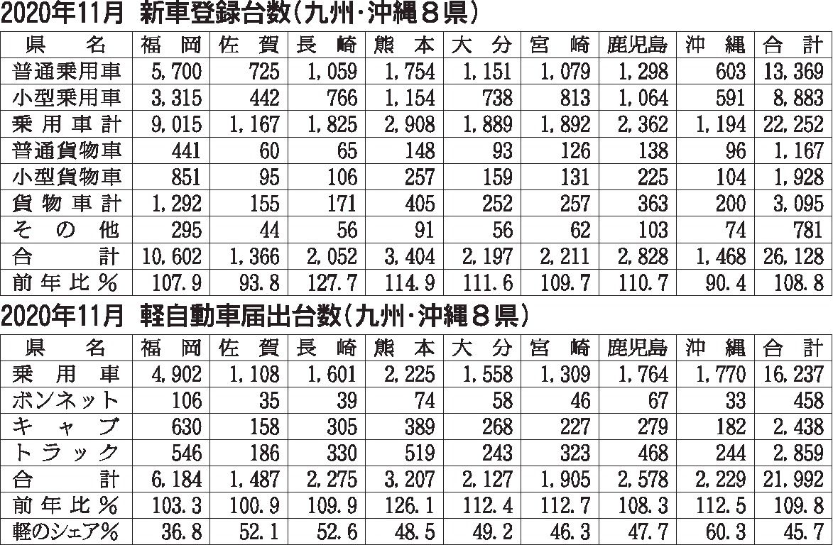九州・沖縄地区の11月の新車販売台数は、前年同月比9・3%増の4万8120台となり、2カ月連続で前年実績を上回った。登録車、軽自動車ともにプラス基調を維持した。夏頃から積み上がった受注残が、下期に入り実績に結びついてきたようだ。台数では5...