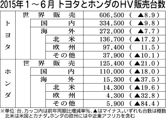 トヨタ自動車とホンダの2015年上期(1~6月)のハイブリッド車(HV)世界販売状況がまとまった。日刊自動車新聞の調べによると、トヨタは前年同期比8・9%減の60万6500台、ホンダは同21・0%減の12万5400台とともに2年ぶりに減少...
