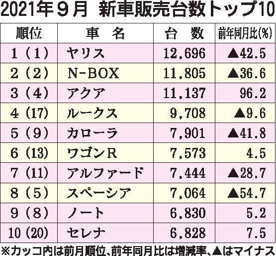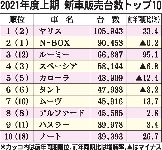 2021年度上期(4~9月)の車名別新車販売はトヨタ自動車「ヤリス」が10万台以上を販売し、首位を奪取した。前年度上期にトップだったホンダの軽スーパーハイトワゴン「N―BOX(エヌボックス)」は小幅ながらも前年を割り込み2位。トヨタ「ルーミー」が大幅伸長により3位に浮上した。半導体不足や新型コロナウイルス感染拡大による部品の調達停滞に伴う生産調整などの影響から、上位10車種のうち4車種が前年割れを余儀なくされた。