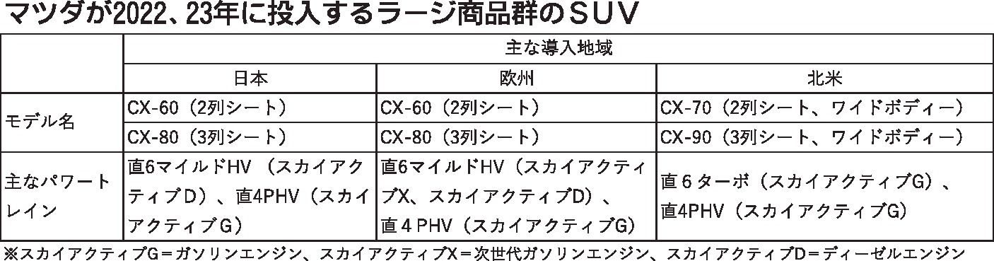 また、スモール商品群では新型SUV「CX―50」を22年1月に米国のトヨタ自動車との合弁工場で生産する。市場が拡大しているSUV商品を拡充してシェアアップを図る。