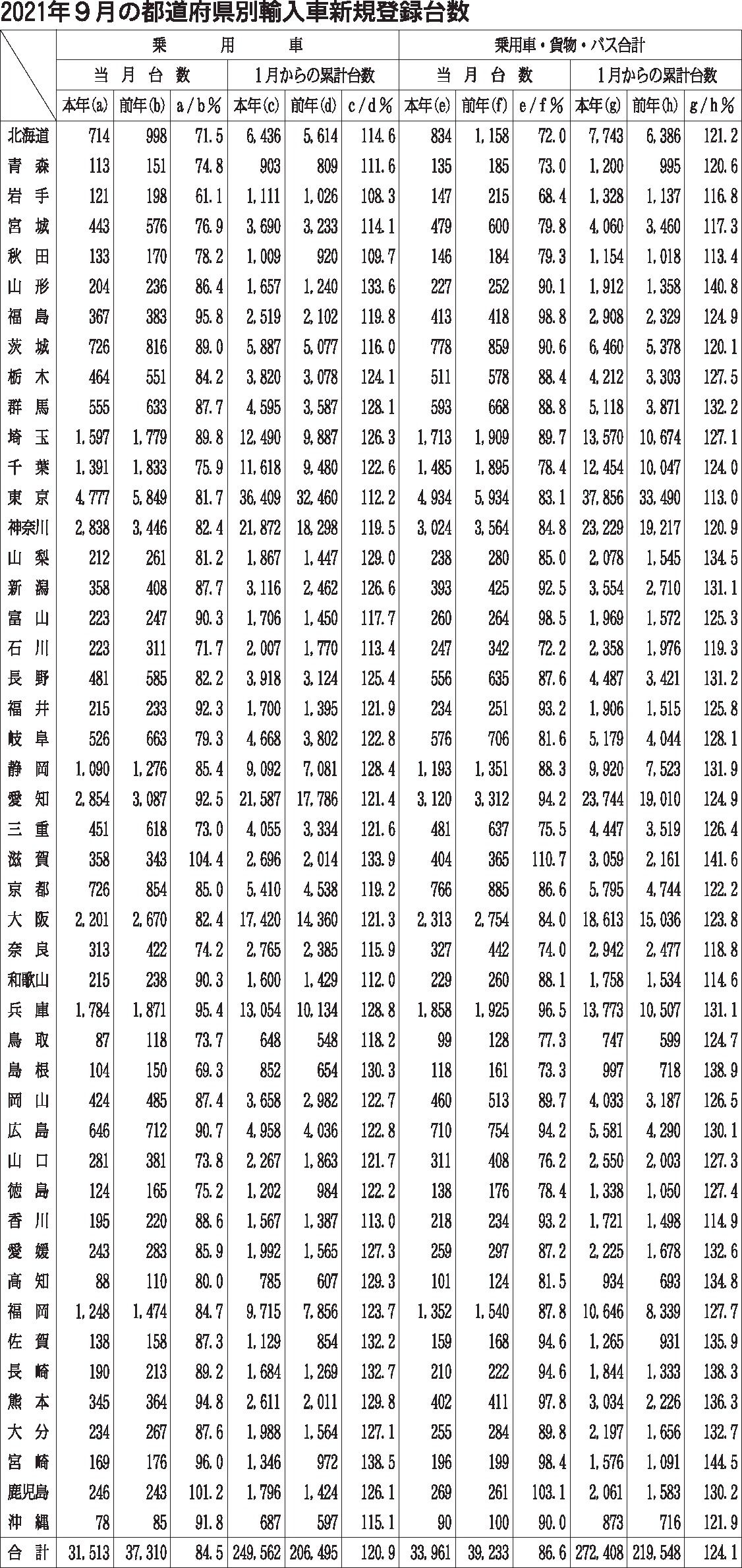 〈2021年9月の都道府県別輸入車新規登録台数〉