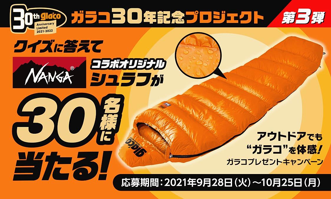 ソフト99コーポレーションは、ガラスはっ水剤「ガラコ」の発売30周年記念プロジェクトの第3弾として、アウトドアブランドのナンガA社とコラボレーションしたオリジナルシュラフ=写真=が30人に当たるキャンペーンを実施する。 同社ホームページ内...