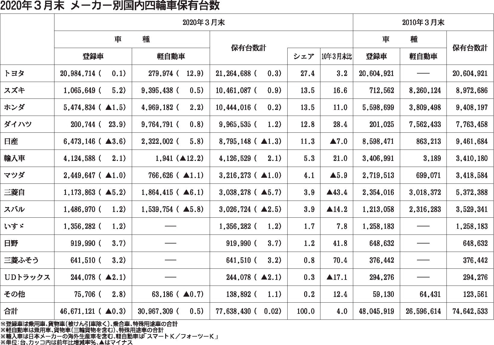 2020年3月末の自動車メーカー別国内保有台数(二輪車を除く)で、スズキがホンダを抜いて2位に浮上した。スズキは登録車と軽自動車ともに前年を超えたほか、増加した台数規模で登録車が初めて軽自動車を上回った。4位のダイハツ工業は21年度内での...