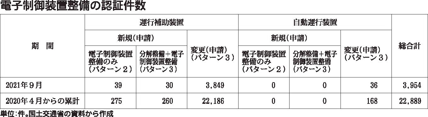国土交通省がまとめた9月の電子制御装置整備の認証件数は3954件だった。3千件超えは2カ月連続となる。内訳は運行補助装置が3918件、自動運行装置が36件だった。地方運輸局別の認証件数は関東が715件、東北が658件、近畿が482件の順に...