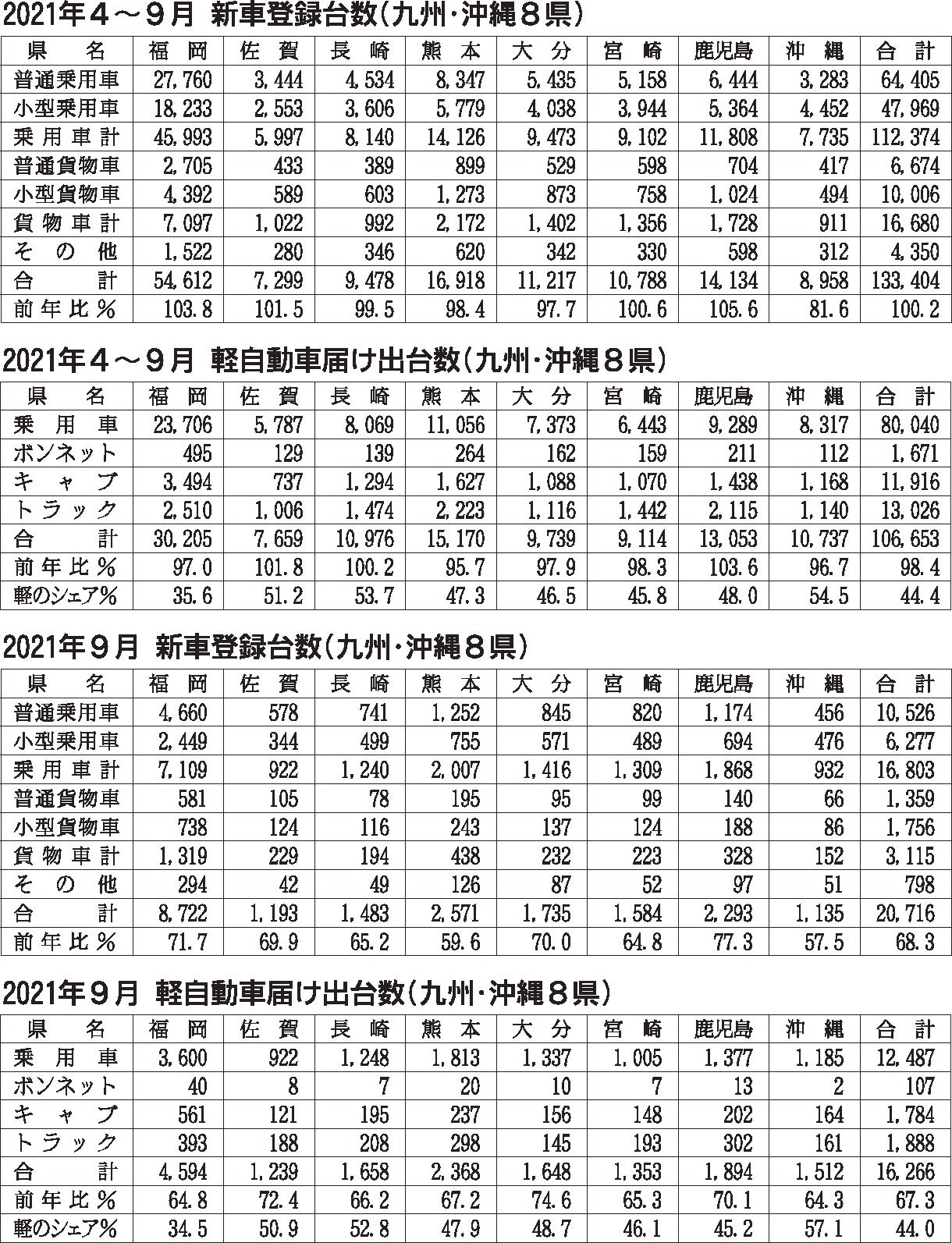 九州・沖縄地区の2021年度上期(4~9月)の新車販売台数(登録車+軽自動車)は、前年同期比0・6%減の24万57台となり、2年連続で前年割れした。6月までプラス基調にあった新車市場だが、半導体不足などの影響を受けて、7月から前年割れが続...