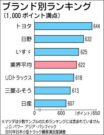 J・D・パワーアジア・パシフィック(アルバート・ラパーズ社長、東京都港区)は25日、「2010年日本小型トラック顧客満足度調査」の結果を発表した。ブランド別総合満足度は、トヨタ自動車が前年の2位から1位を獲得。2位は前年1位の日野自動車、...