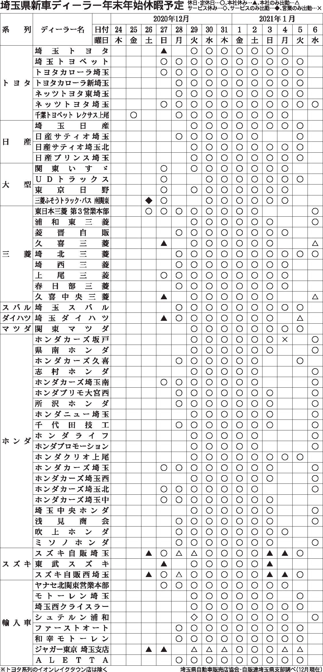 〈埼玉県新車ディーラー年末年始休暇予定〉