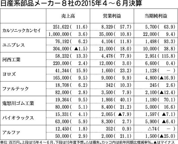 日産自動車との取引が多い部品メーカー8社の2015年4~6月期決算は、日産の販売が北米を中心にグローバルで堅調だったことや円安・ドル高の進行により、全社で売上高が前年同期を上回った。増収効果に加え、生産性向上の取り組みが効果を出し、営業損...