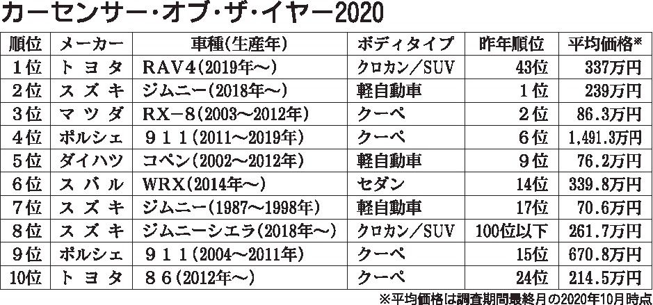 カーセンサー・オブ・ザ・イヤー2020、1位トヨタ「RAV4」