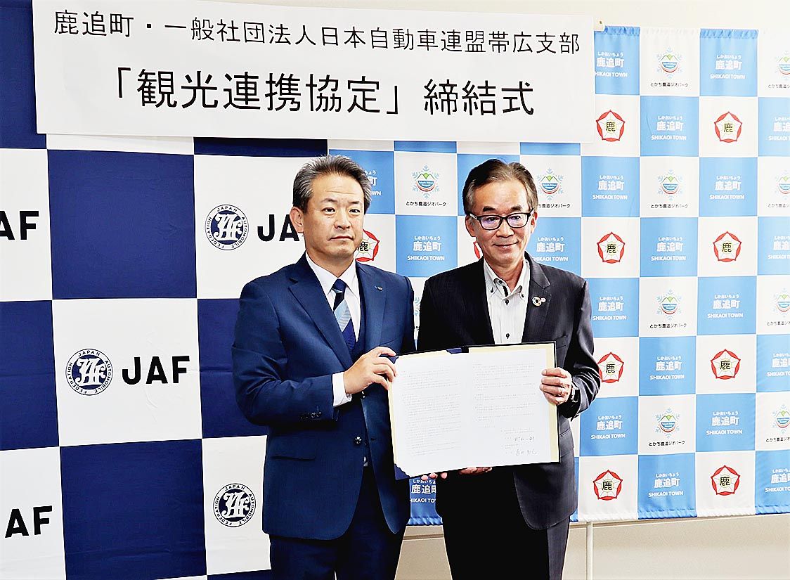【帯広】日本自動車連盟(JAF)帯広支部(村松一樹支部長)は、鹿追町と観光連携協定を締結し、鹿追町役場で調印式を行った。村松支部長と鹿追町の喜井知己町長が調印書を交わした。観光連携協定は帯広市、広尾町、大樹町、幕別町に続いて5カ所目。喜井...