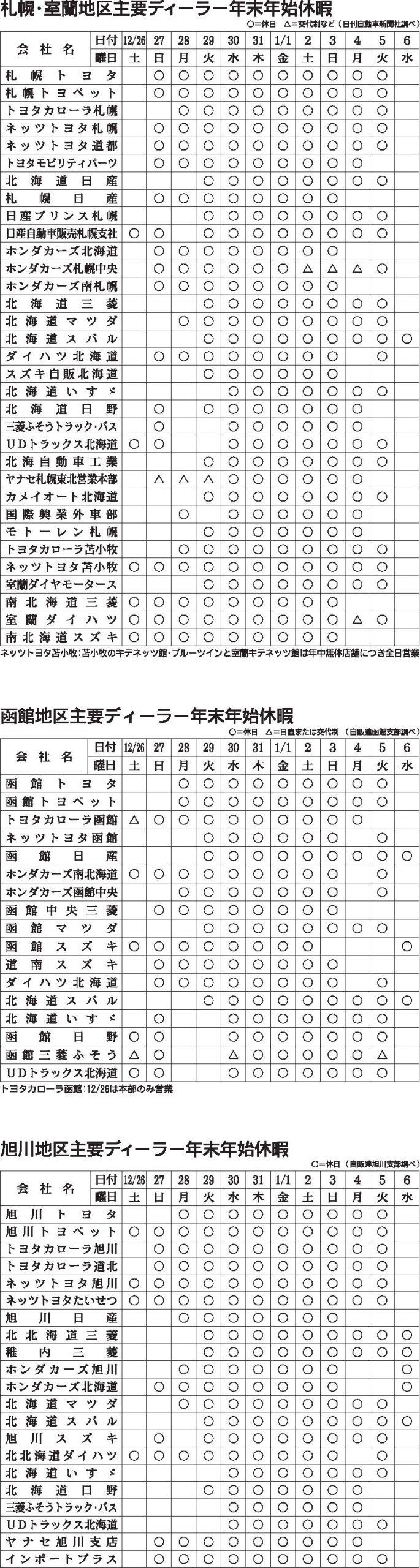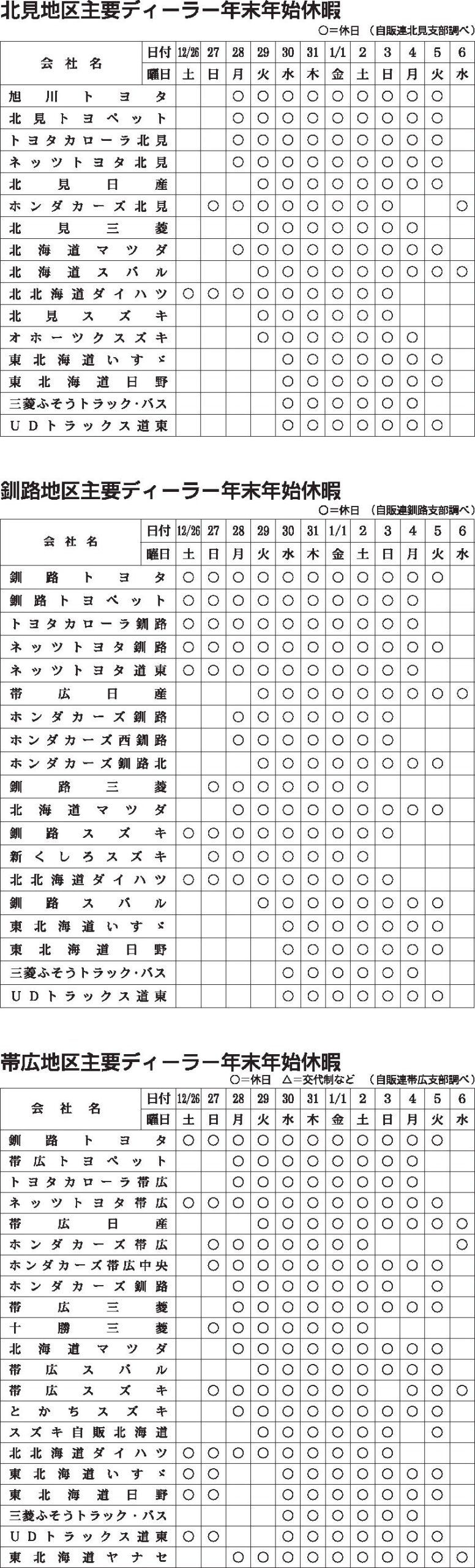 道内新車ディーラーなど127社の年末年始休暇日程がまとまった。札幌地区では札幌日産、ホンダカーズ北海道、ホンダカーズ南札幌、ダイハツ北海道、スズキ自販北海道の5社が4日に営業を開始する。新型コロナウイルス感染症の拡大により、初売りイベント...