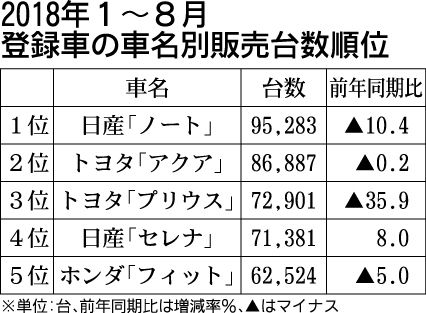 軽自動車を除く2018年(1~12月)の車名別販売で、日産自動車「ノート」の首位獲得が視界に入ってきた。1~8月の累計販売台数は9万5283台で、2位のトヨタ自動車「アクア」と約8400台差の暫定首位にある。リードを維持できれば暦年ベース...
