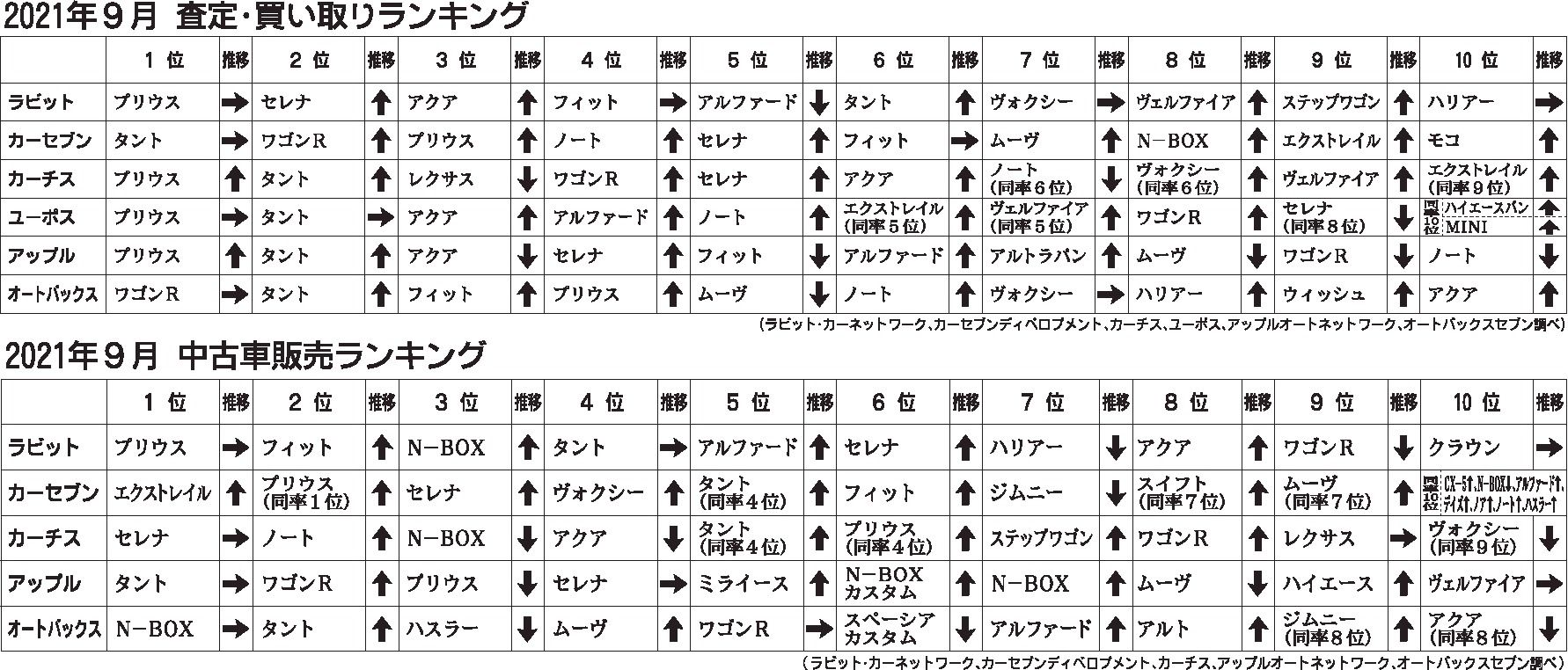 〈2021年9月 査定・買い取り/中古車販売ランキング〉