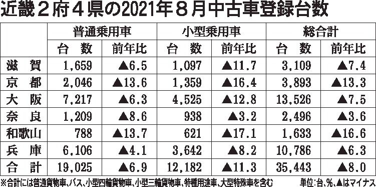 近畿2府4県における8月の中古車登録実績(軽自動車を除く)がまとまった。新規・移転・変更手続きを合算した登録台数は前年同月比8・0%減の3万5443台で、3カ月連続で前年台数を下回った。全府県が前年割れするのは2カ月連続で、特に京都と和歌...