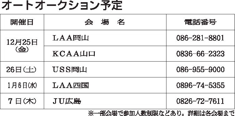 〈オートオークション予定〉中四国地区 2020/12/25~2021/1/7