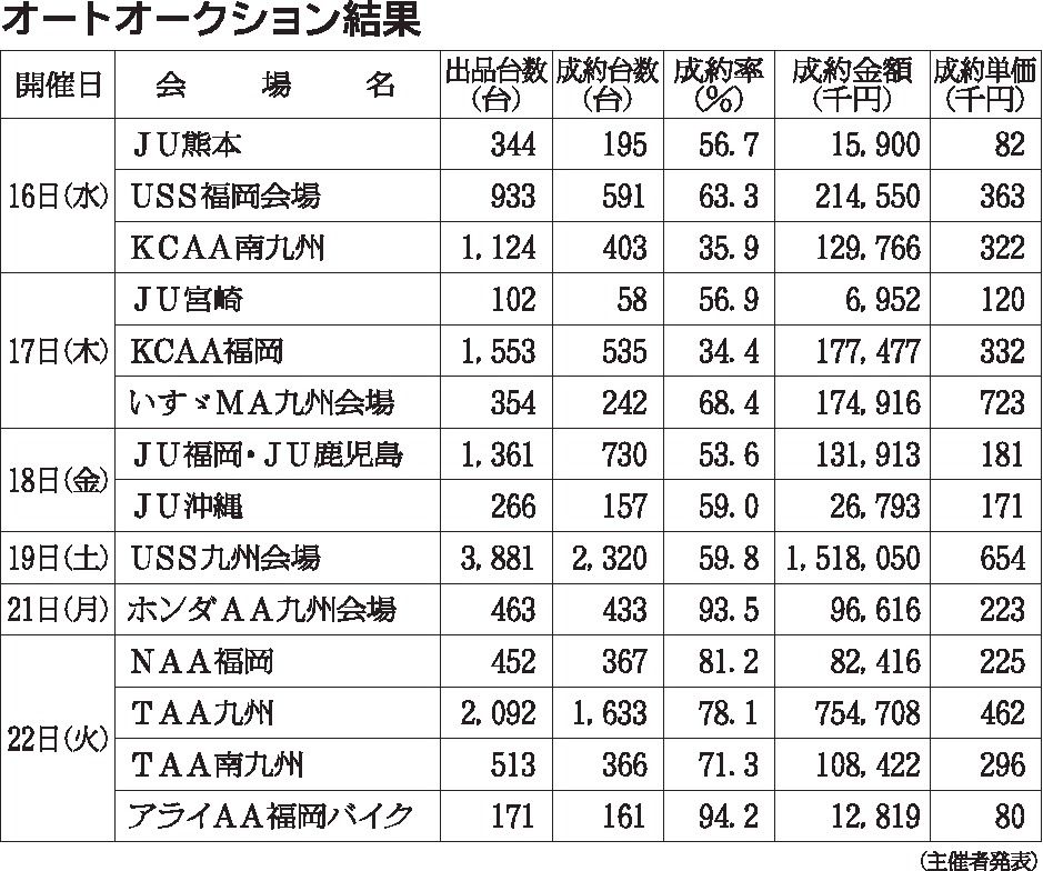 〈オートオークション結果〉九州地区 2020/12/16~22