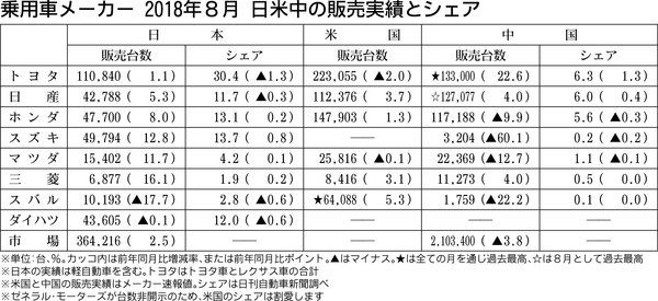 乗用車メーカーの8月の日米中販売台数は、中国の総市場が2カ月連続で減少した中、同国でトヨタ自動車と日産自動車、三菱自動車の3社がプラスを確保した。日産は8月として、トヨタは全ての月を通じて過去最高を更新した。米国はセダン市場の低迷などによ...