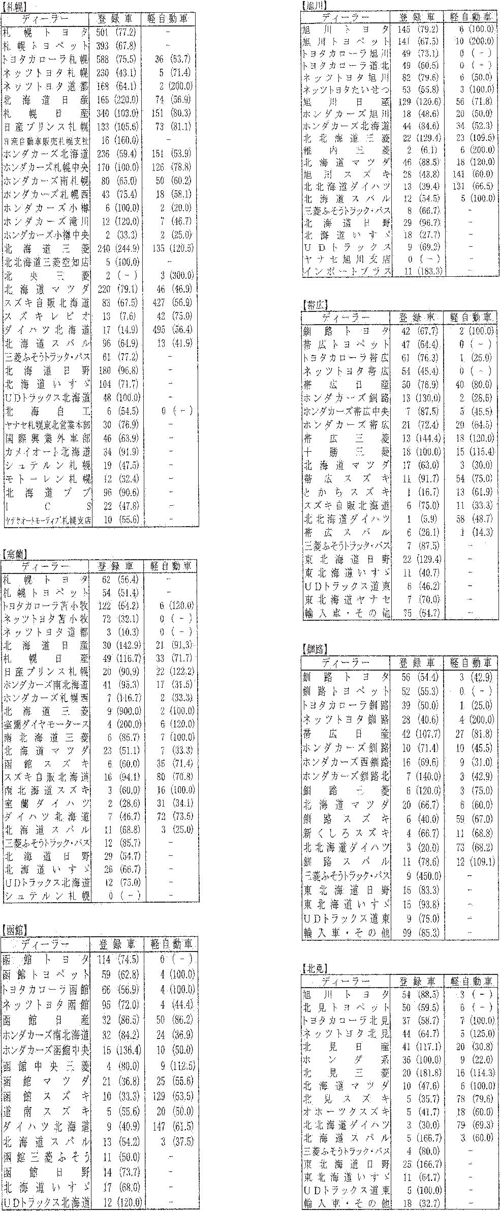 〈9月度全道管内別ディーラー別新車登録・届け出台数〉(カッコ内は前年同月比)※札幌管内ホンダ系・スズキ系の登録台数は自販連正会員分