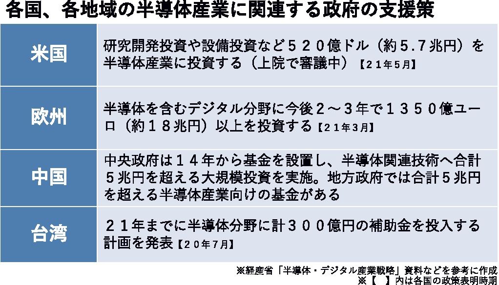 経済安全保障を強化しようと日本政府が半導体産業をテコ入れする。台湾積体電路製造(TSMC)が熊本県内に新設する半導体工場に数千億円規模の補助金を出す検討に入ったほか、電動車に不可欠な大電流にも耐える「パワー半導体」の開発支援として2030...