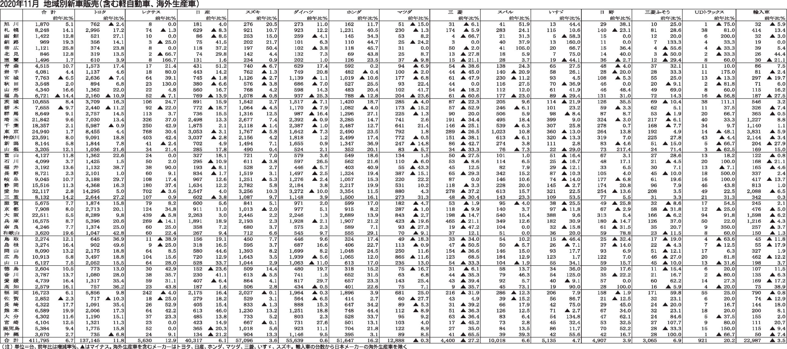 〈2020年11月 地域別新車販売(含む軽自動車、海外生産車)〉