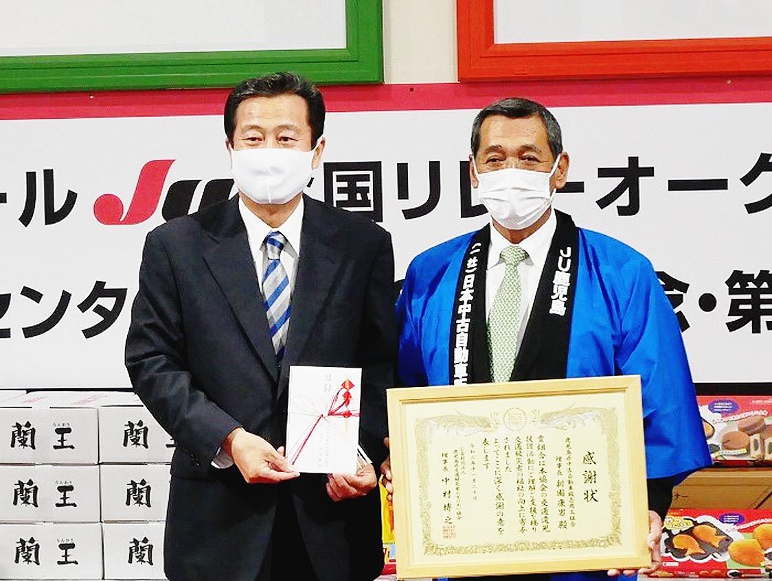 【鹿児島】JU鹿児島(新園康男理事長)はこのほど、地域社会への貢献活動の一環として、鹿児島県交通被災者たすけあい協会(中村博之理事長=トヨタカローラ鹿児島社長)に義援金50万円を寄付した。 JU鹿児島のオークション会場で贈呈式があり、新園...