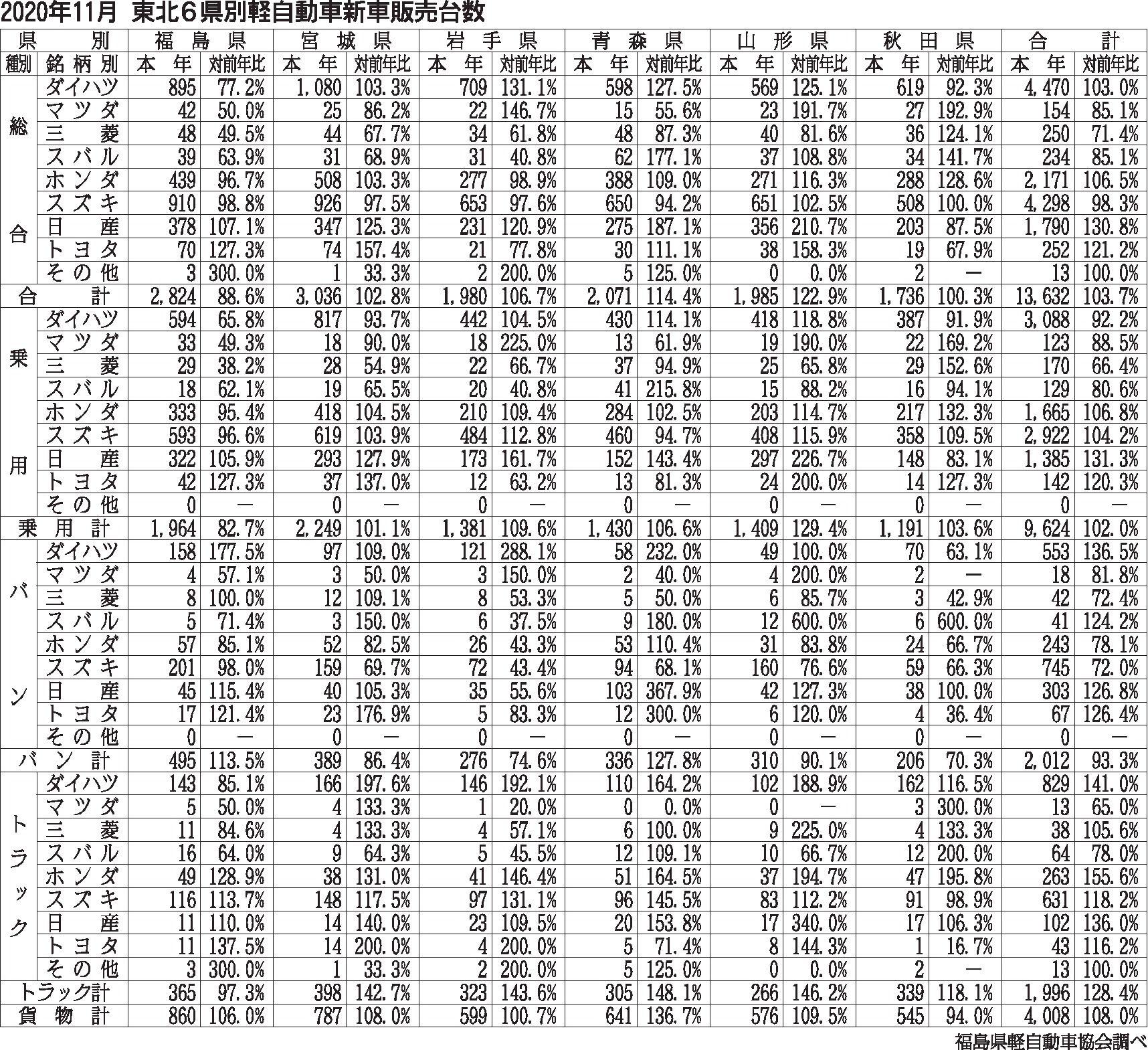 〈2020年11月 東北6県別軽自動車新車販売台数〉