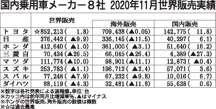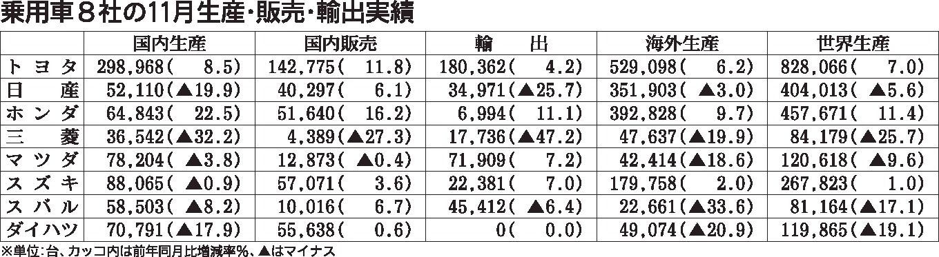 国内乗用車メーカー8社が25日に発表した11月の世界生産台数は、前年同月比0・3%減の236万3399台となり、3カ月ぶりにマイナスに転じた。市場が堅調な中国で生産が拡大したものの、日本や米国、新興国などではメーカーごとで回復度合いに差が...