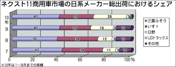 経済発展が見込まれるNEXT11(ネクスト11)市場で、日系トラックメーカーが攻勢をかけている。2010年1~9月に日系メーカーは約12万7千台の大~小型トラックを出荷し、9カ月間でリーマンショックの影響が出た09年の約8万3千台を大きく...