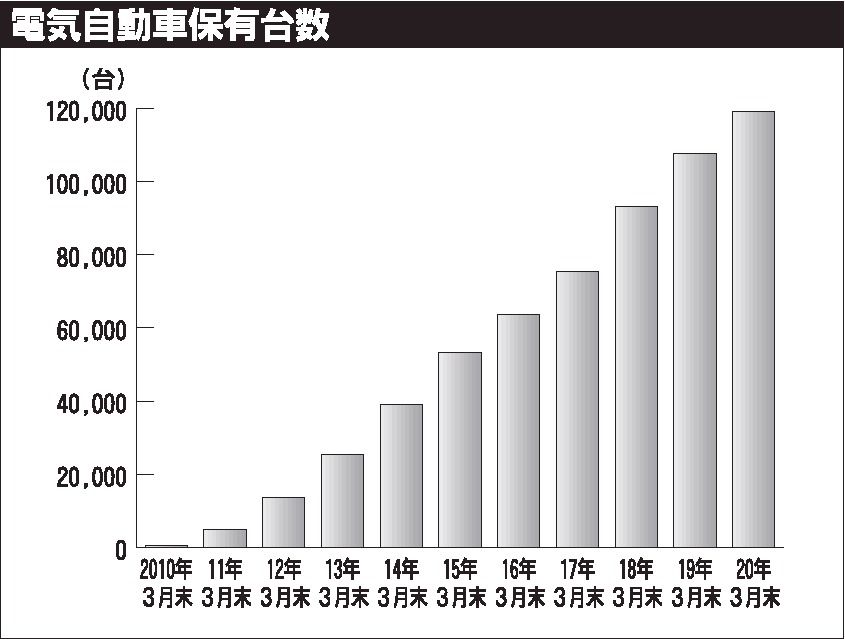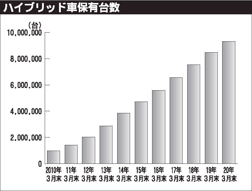 電動車両の国内保有台数は、右肩上がりで増加している。自動車検査登録情報協会(自検協、後藤悦治郎理事長)の統計によると、2020年3月末時点のプラグインハイブリッド車(PHV)を含むハイブリッド車(HV)の保有台数は、前年比9.9%増の932万6574台となった。21年3月末には1千万台の大台に達する見通しだ。電気自動車(EV)も同10.6%増の11万9159台と、10年連続で増加した。