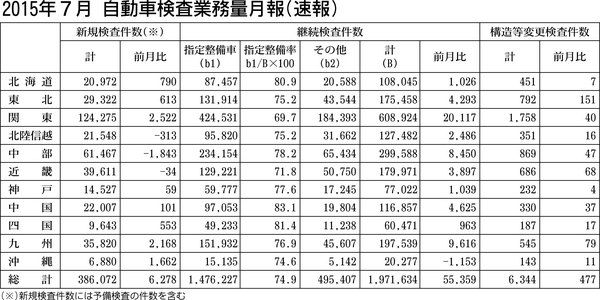 国土交通省は7月の自動車検査業務量(速報)をまとめた。それによると新規検査件数は前年同月比5183件増(1・4%増)の38万6072件、継続検査件数は10万8537件増(5・8%増)の197万1634件。構造等変更検査件数は91件減(1・...