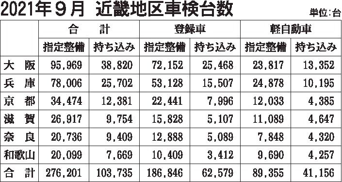 近畿2府4県の2021年9月の継続検査(車検)台数(軽自動車を含む)は、前年同月比1・1%増の37万9936台で、2カ月連続で増加した。登録車は前年より6台多い24万9425台、軽は同3・3%増の13万511台でどちらも2カ月連続で前年台...