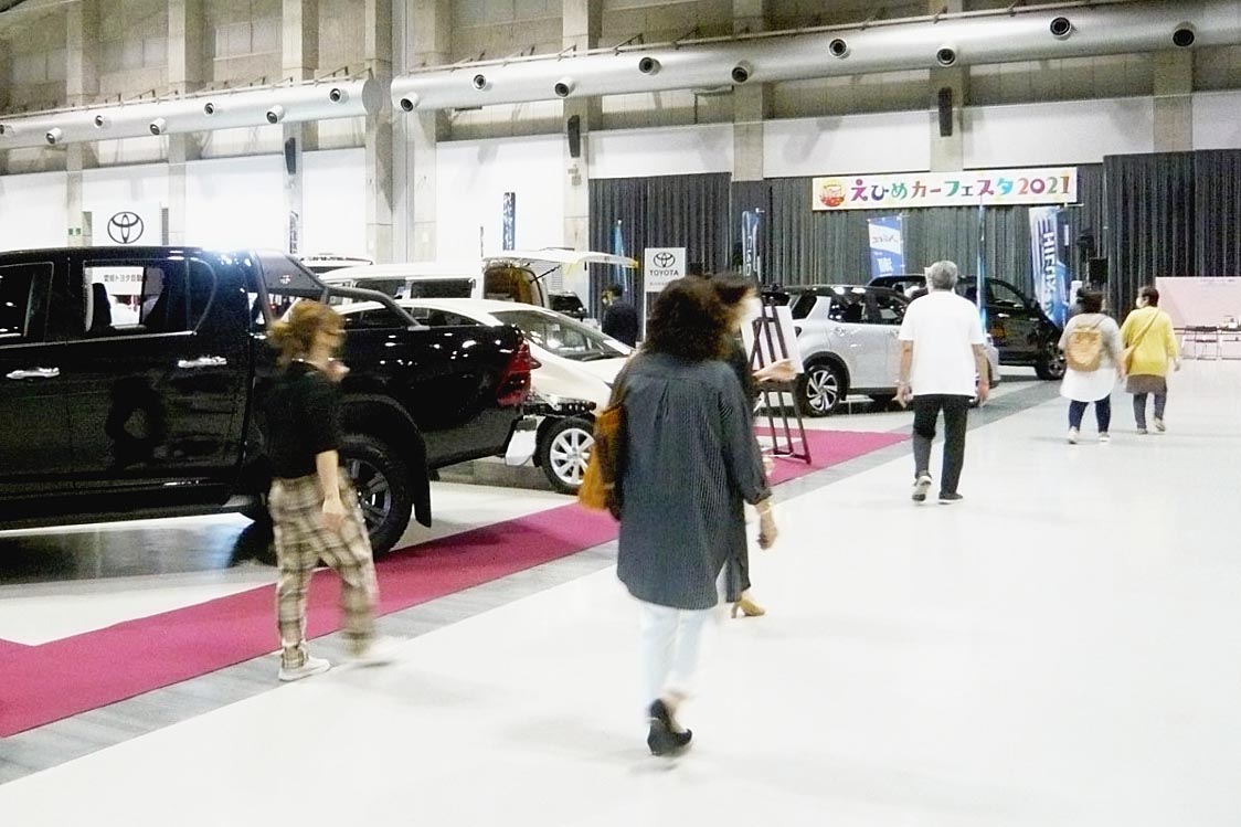 【松山】日本自動車販売協会連合会愛媛県支部(岡豊支部長)は、松山市内のアイテムえひめ(愛媛国際貿易センター)で、新車展示会「えひめカーフェスタ2021」を開催した=写真。コロナ禍で変化した自動車に対するユーザー意識を反映した展示内容とし、...
