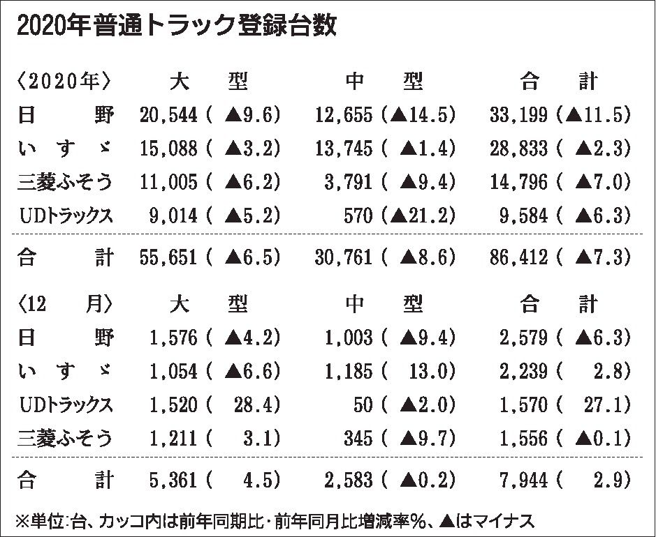 業界筋がまとめた2020年1~12月の普通トラック(積載量4㌧以上、大型、中型トラックの合計)の新車販売台数は、前年比7・3%減の8万6412台だった。新型コロナウイルス感染拡大の影響で需要が落ち込み、2年ぶりに前年実績を下回った。12月...