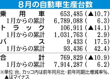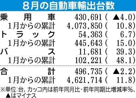 日本自動車工業会(自工会、青木哲会長)は30日、8月の四輪車生産・輸出実績を発表した。前月まで過去最長タイ記録(36カ月間)だった輸出台数は、主力の北米向けが急減速したため49万6735台(前年同月比2.2%減)と微減に終わり、約30年ぶ...