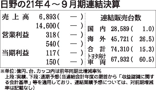 日野自動車は28日、2022年3月期の営業利益を期初見通し比で14.9%増の540億円に上方修正したと発表した。東南アジアでの販売が想定以上に回復した影響が大きい。売上高、当期純利益の見通しはそれぞれ同9.8%増の1兆4600億円、同36.4%増の150億円に引き上げた。4~9月期の売上高は前年同期比3.4%増の6893億円、営業利益は318億円で黒字に転換した。