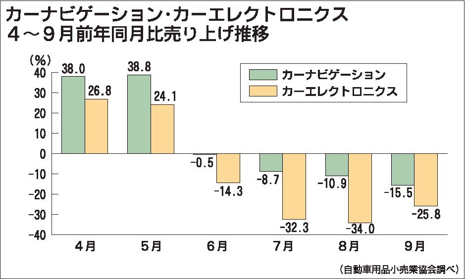 用品小売りの現場でカーエレクトロニクス製品の販売不振が深刻化している。自動車用品小売業協会(APARA、小林喜夫巳会長)がまとめた用品売上高統計を品目別に見ると、「カーナビゲーション」と「カーエレクトロニクス」は6月から4カ月連続で前年実...