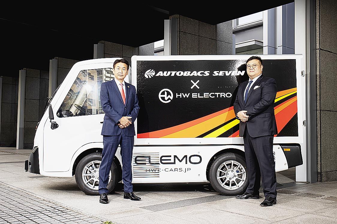 HWエレクトロが販売する小型商用EV「エレモ」の販売やメンテナンスを将来的にオートバックス店舗で担う計画とするほか、新規サービスの共同開発などでも連携するとしている。