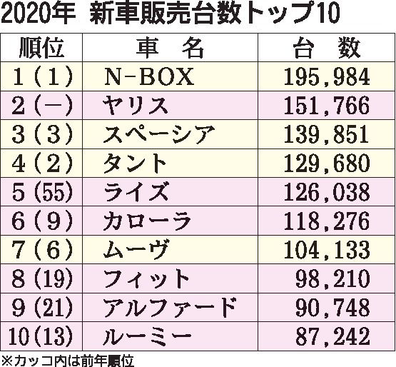2020年の車名別新車販売台数は、登録車と軽自動車を合わせた総合順位でホンダの軽自動車「N-BOX(エヌボックス)」が4年連続でトップだった。前年比22・7%減と大きく落ち込んだものの、1~8月の8カ月間にわたってトップとなり、年間首位を...