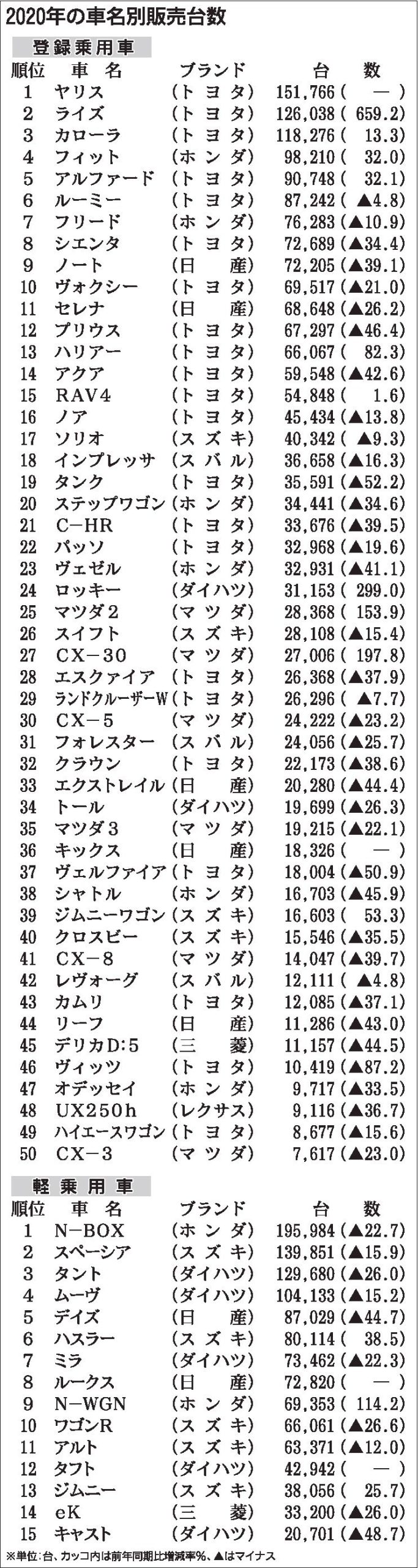 〈2020年の車名別販売台数〉