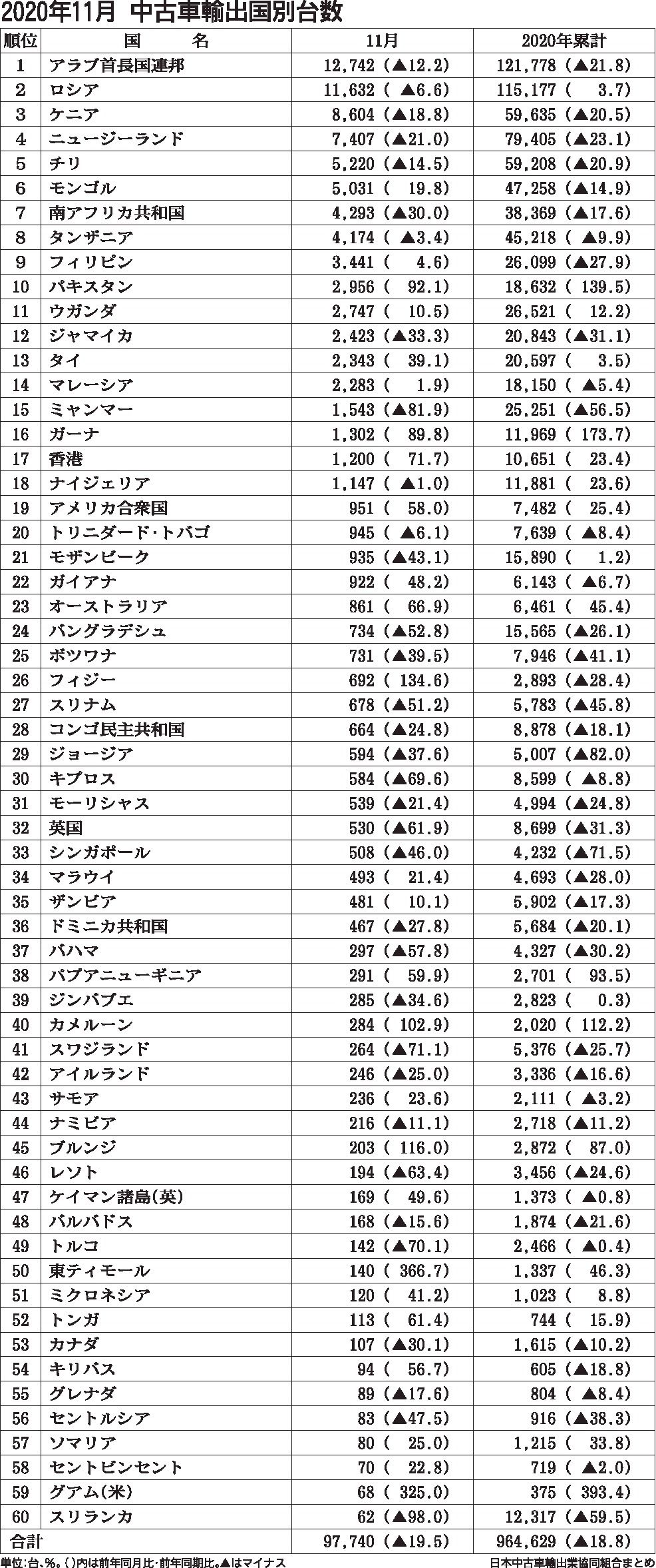 2020年11月の中古車輸出、UAE向け減も首位維持