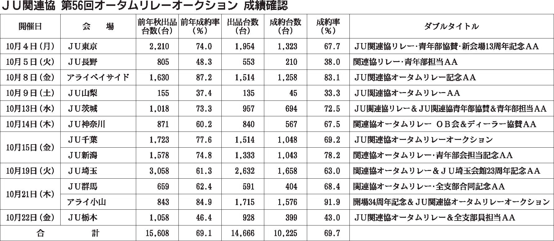 JU関連協(塚田長志理事長)は、「第56回オータムリレーオークション」の結果をまとめた。それによると出品台数が1万4666台となり、目標まであと584台届かなかった。同企画は関東甲信越10都県の会員12会場(賛助会員2会場含む)が10月4...
