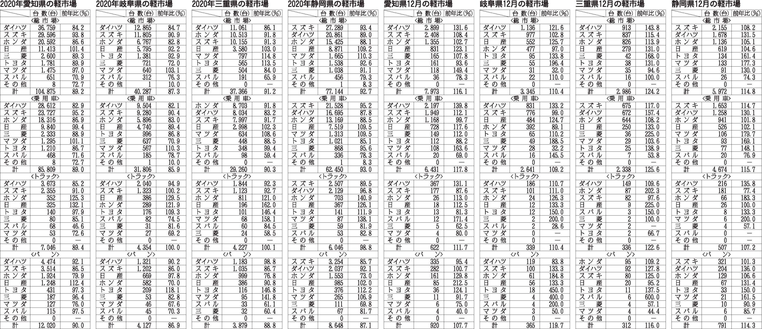 〈中部4県の軽市場〉愛知・岐阜・三重・静岡 2020年/2020年12月