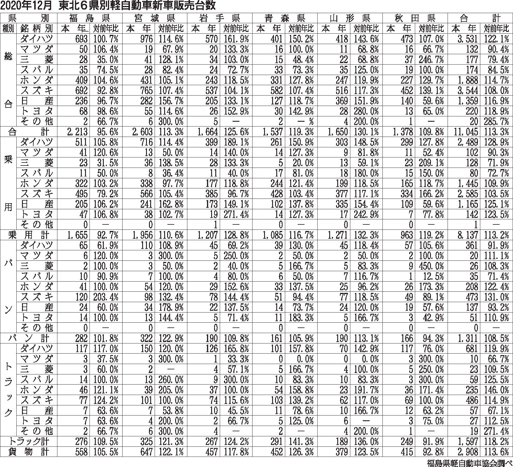 〈2020年12月東北6県別軽自動車新車販売台数〉