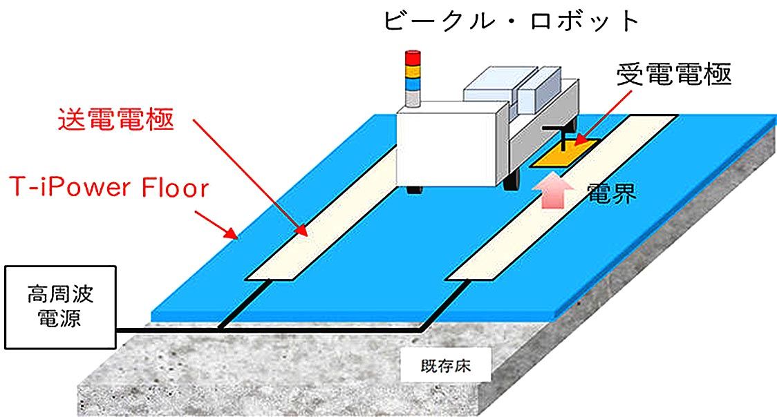 開発品は、給電床が走行中のAGVやロボットに電力をワイヤレスで送電する。給電床は厚さ4mmの薄型樹脂パネルにテープの送電電極を採用し、従来の半分の床厚で施工を可能にする。施工法は薄型樹脂パネルを連続して敷設する工法で、従来の塗床工法で施工する給電床に比べて施工性にも優れるという。