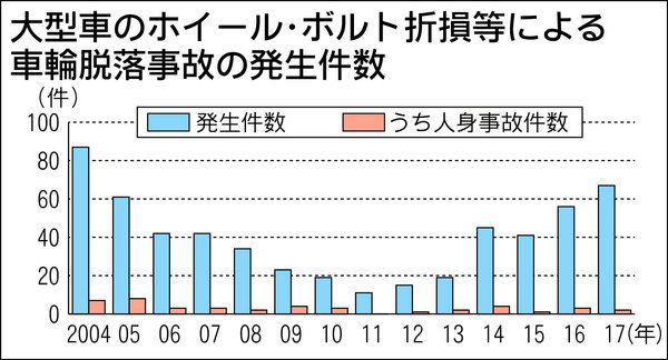 大型バス・トラックでホイール・ボルトが折損したことにより車輪が車体からはずれ、事故に至るケースが増加している。国土交通省のまとめによると、2017年度における大型車の車輪脱落事故は67件発生しており、前年度と比べて11件増加した。この中で...