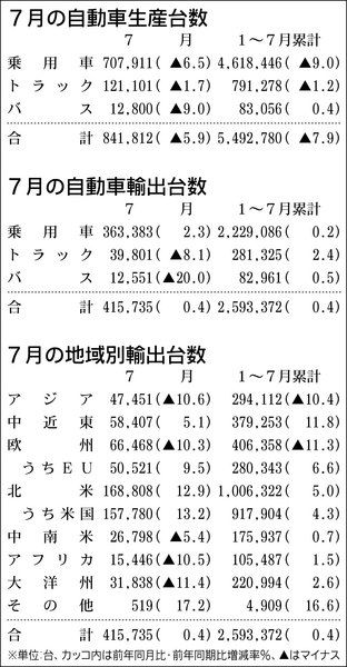 ◆国内生産5.9%減、需要低迷を反映 日本自動車工業会(自工会)が31日発表した自動車国内生産実績によると、7月の四輪車生産台数は前年同期比5・9%減と13カ月連続マイナスとなった。輸出台数は同0・4%増と微増だったが、国内需要の低迷が生...