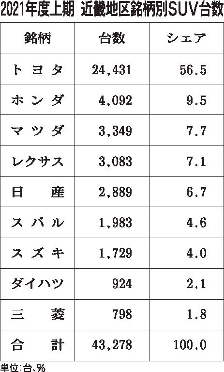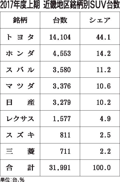 直近5年間で近畿のSUV市場は約1・35倍に膨れ上がったが、必ずしもその恩恵をすべての銘柄が受けているわけではない。銘柄別のシェアの変遷からはトヨタ陣営1強の構図が浮かび上がってくる。 2017年度上期(4~9月)の国産車メーカーのSUV...