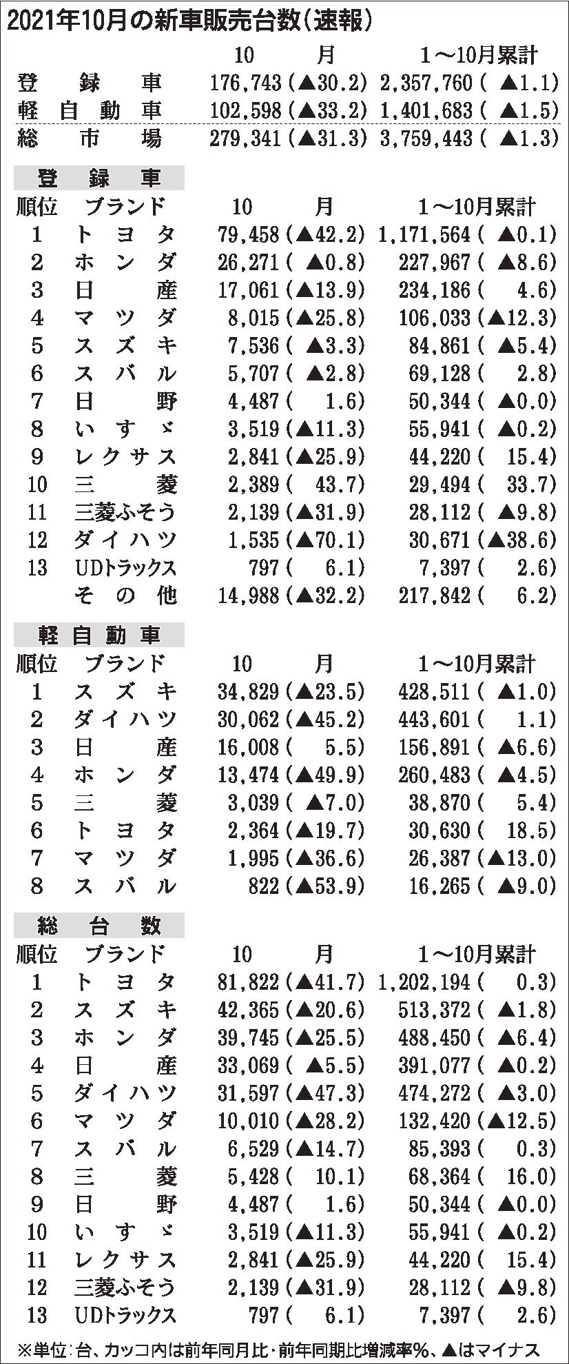 2021年10月の新車販売台数、月次最低31%減 供給停滞が深刻な影響