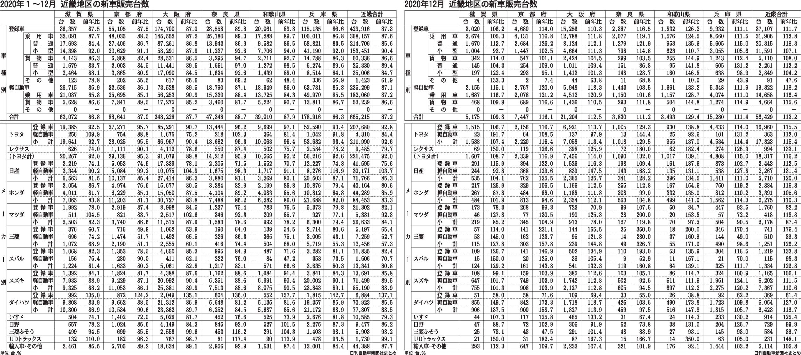 近畿2府4県の2020年(1~12月)の新車販売台数は登録車と軽自動車の合計が2年連続のマイナスとなる前年比12・8%減の66万5215台だった。新型コロナウイルス感染拡大と消費税増税による負の影響で近畿の新車市場も大きな打撃を受けた。た...