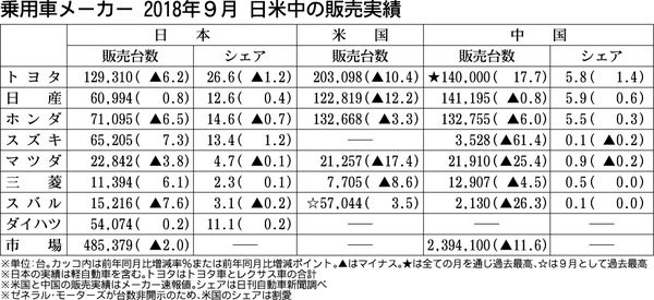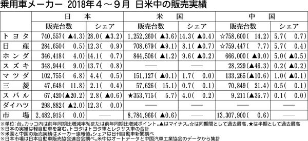 乗用車メーカーの2018年度上期(4~9月)の日米中販売台数は、トヨタ自動車と日産自動車が中国販売で上期として過去最高を更新した。総市場に頭打ち傾向が見られる中、積極的な新車攻勢などによりシェアを拡大した。一方、米国ではセダン市場の低迷な...